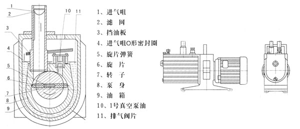2XZ型旋片式真空泵系双级高速直联结构旋片式真空泵(以下简称泵)。它有偏心地装在泵腔内的转子,及转子槽内的旋片。转子带动旋转时,旋片紧贴腔壁,把进、排气口分隔开来,并使进气积腔容积周期性地扩大而吸气,排气腔容积则周期性地缩小而压缩气体,推开排气阀排气,从而获得真空。图一为单级泵的工作原理示意图。双级是两个单级串联而成。 2XZ型泵装有气镇阀,具有延长泵油使用时间和防止泵油混水的作用。 2XZ型泵具有体积小、重量轻、噪声低、起动方便等优点。此外,还有防止返油的措施(2XZ-8无)和防止油封漏油污染场地的措施。 | |