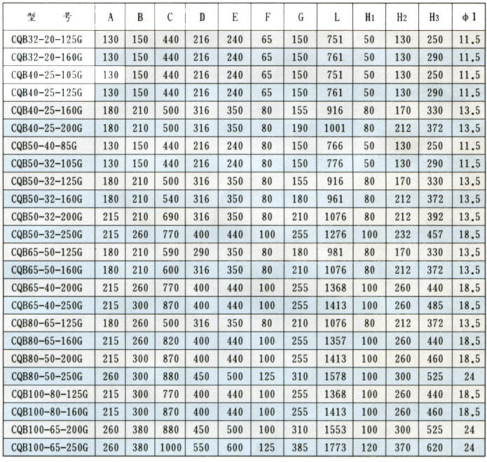CQB-G系列磁力驱动离心泵外形安装尺寸表: |