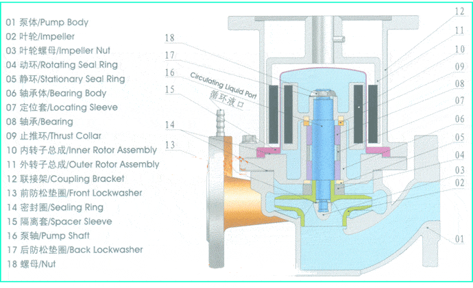 1、进行无泄漏运转,可输送易燃、易爆、剧毒及腐蚀介质; 2、材质优良,泵体、叶轮、隔离套等过流部件均采用优质不锈钢制造; 3、轴套采用高耐磨的碳化硅、碳化钨,滑动轴承采用碳石M106K,并设置了润滑油槽,有效地保证泵的使用寿命;4、立式安装,结构紧凑、占地面积小; 5、振动小,噪音低,运行特别平稳; 6、泵的绝大多数零部件与CQB系列磁力泵互换,泵的性能与CQB系列相同;流量为3.2-100m 3 /h;扬程为20-80m;功率为0.75-75Kw