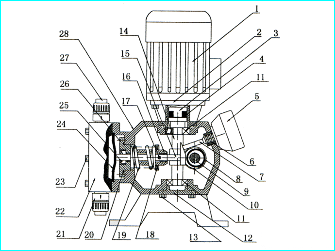 4工作原理:电机经联轴器带动蜗杆并通过蜗轮减速使主轴和偏心轮作回转运动,由偏心轮带动挺杆在导筒内作往复运动。连同膜片,通过单向阀的作用使泵腔内逐渐形成真空,此时吸入阀关闭,排出阀打开,吸入液体;当液体膜片向前死点移动时,此时吸入阀关闭,液体在膜片的推动下排出。在泵通过调节一定的行程的往复顺还工作形成连续有压力、定量的排放液体。